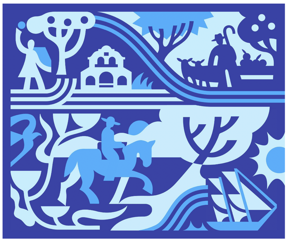 - Apricot and plum tree, Early Settlement - Villa Francisca, - Rancho Posolmi (Ohlone) shepherd - Sheep and Fruit Trees - Tern and Flowers - Early Spanish traveler on horseback - Trading/Transport sailing vessel