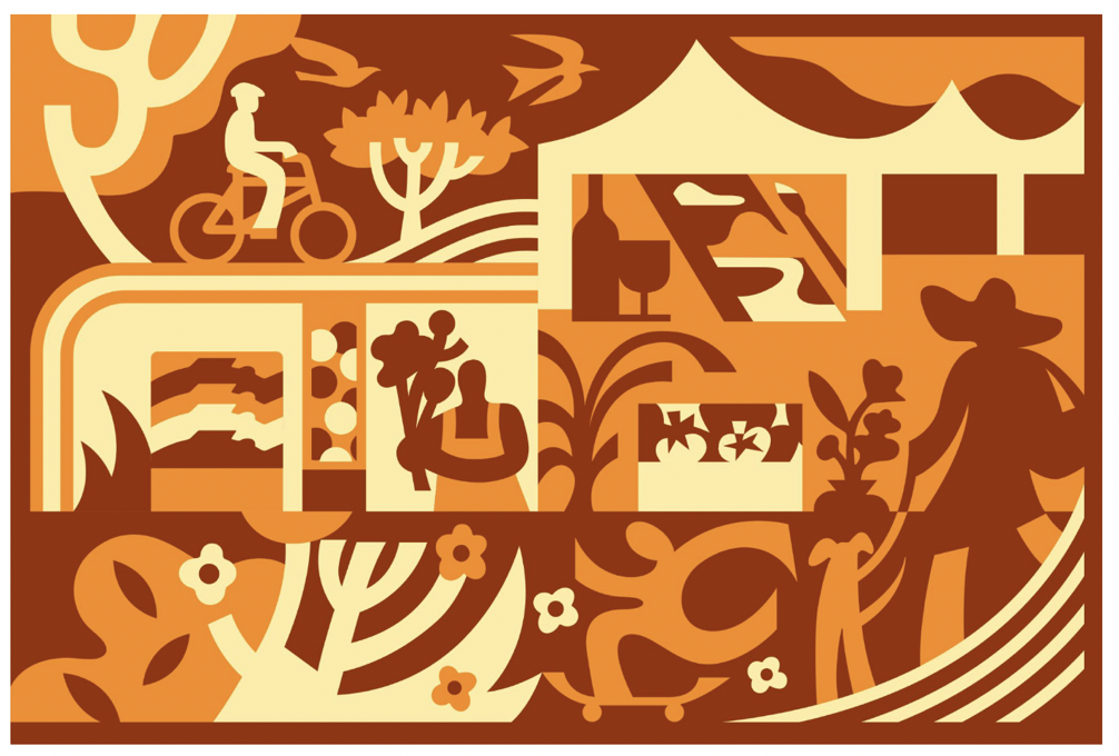 This mural panel captures the energy, color, and connection of Mountain View today, a city where nature, culture, and community come together in daily rhythms of life. A bicyclist rides through town, reflecting Mountain View's commitment to sustainability, healthy living, and accessible streets. Nearby, a skateboarder glides along the path, and a dog walker strolls with a loyal companion, capturing the friendly, active spirit of the community. The mural blossoms with native plants like Toyon, with its bright red berries, and flannel bush, glowing with vibrant yellow flowers, reminders of the region's natural beauty woven into urban life. At the heart of the scene, the Mountain View Farmers' Market bursts with fresh seafood, colorful fruit, and flowers, showcasing local abundance and a love for good food and gathering. Festive banners hint at the city's beloved Art and Wine Festival, where creativity flows as freely as conversation, bringing neighbors together to celebrate local artists, makers, and music under the California sun. In this mural, everyday moments become symbols of a thriving, inclusive city, where people connect with each other, with nature, and with the rhythm of modern life in Mountain View.